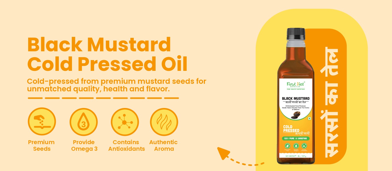 First Diet Nutrition’s Black Mustard Oil is extracted using traditional cold press methods from premium mustard seeds of Rajasthan. Unfiltered, chemical-free, and rich in natural pungency, this oil delivers authentic flavor, essential nutrients, and powerful health benefits. Ideal for cooking, pickles, and daily wellness.